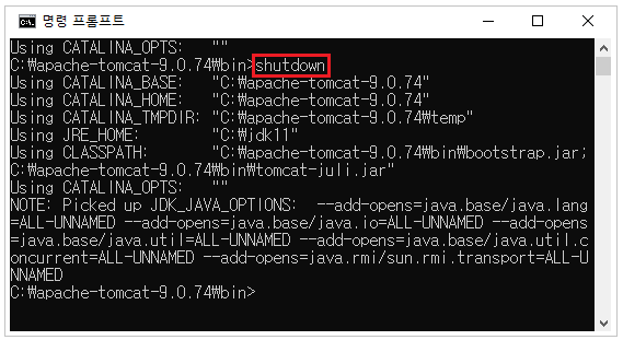 6. 톰캣 종료: 도스창에 shutdown 입력