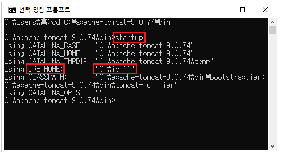 4. 톰캣 실행: 도스창에 톰캣 설치 경로로 이동하여 startup 입력